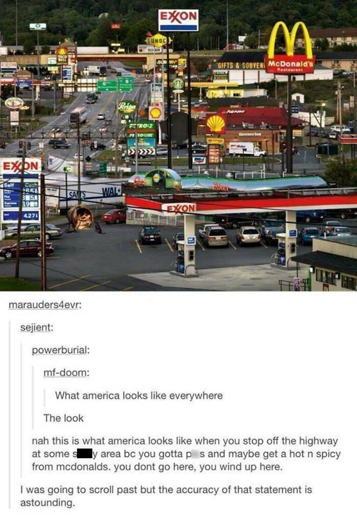 But another thing that you might experience is that whenever you drive off the highway to stop in a town to get some rest or a quick bite to eat, you will see this. A bunch of gas stations and random restaurants pooled together in what is probably the most visually unpleasing thing we’ve ever seen.